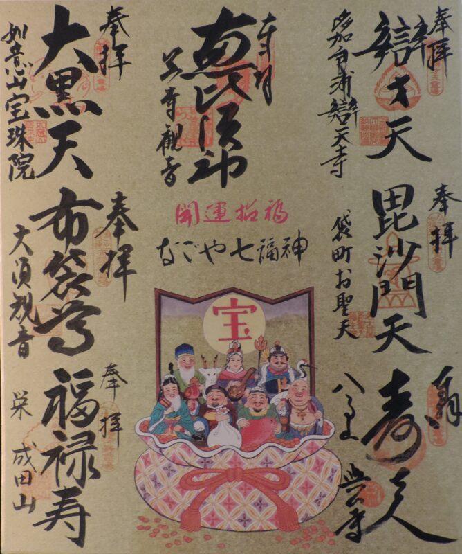 大色紙は、約45.5cm×38.0cmの大きなサイズで、七福神のイラストが印刷された台紙に、各寺院で墨書と朱印を書いていただきます。