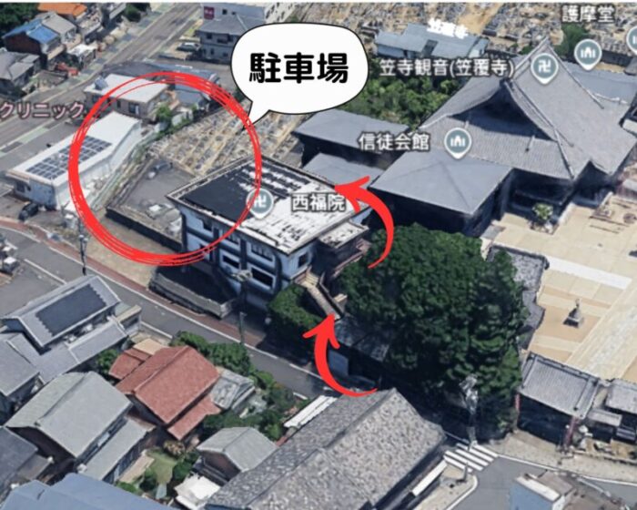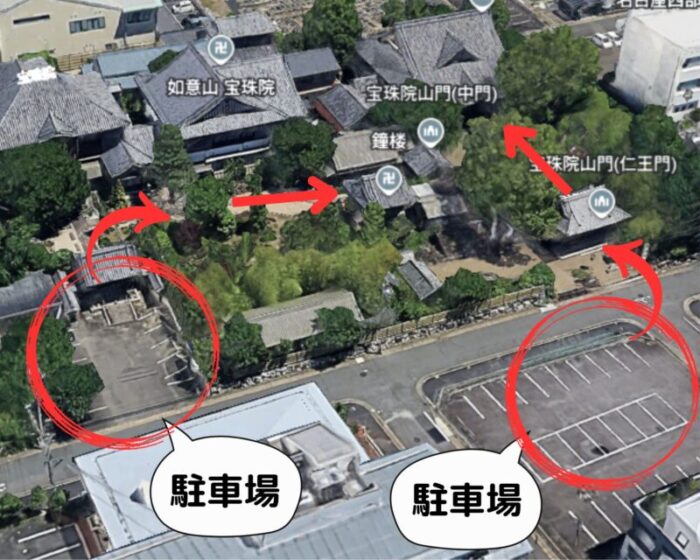 宝珠院(中川区)、笠寺観音(南区)、興正寺(昭和区)、辯天寺(港区)には専用駐車場(十台程度)がありますが、年末年始やイベント時は駐車場が閉鎖されることがあります。また、成田山萬福院(中区)、福生院(中区)の専用駐車場は2~3台程度しか駐車できないため、周辺のコインパーキングを利用することになります。