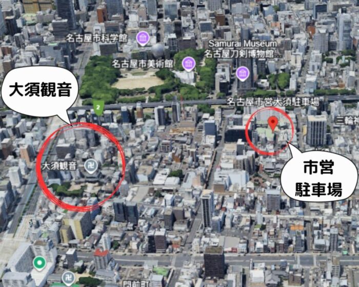 大須観音から少し距離はありますが、名古屋市営大須駐車場(700台以上収容可能な大型立体駐車場)が便利で、大須商店街での食べ歩きも楽しみながら参拝も良いものです。